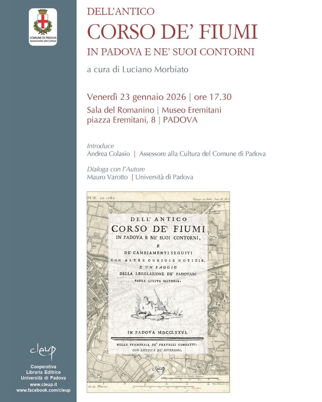 Venerdì 23 gennaio alle ore 17.30 nella Sala Romanino del Museo Eremitani di Padova verrà presentato il libro "Dell’antico corso de’ fiumi in Padova e ne’ suoi contorni" a cura di Maurizio Morbiato.