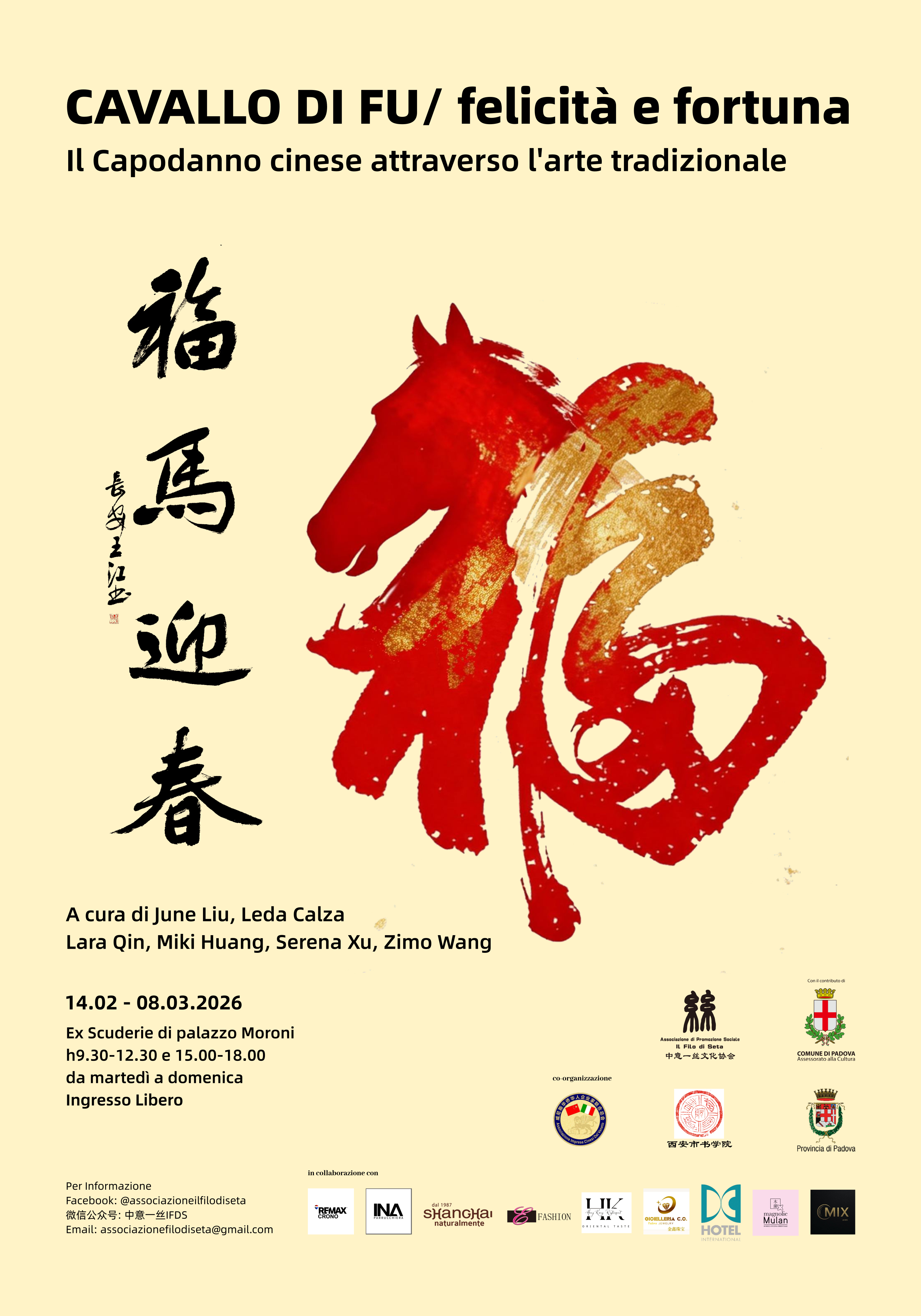 L'Associazione di promozione sociale Il Filo di Seta propone il progetto Cina è viCina, giunto alla sua V edizione, iniziato con La festa della Luna 2025, che continua nel 2026 con i festeggiamenti del Capodanno cinese a Padova e in Veneto, con una serie di eventi nati dalla collaborazione dell’Assessorato alla Cultura del Comune di Padova. Gli spazi di Palazzo Moroni ospiteranno una mostra ed un’istallazione, che continuano il racconto culturale iniziato nelle scorse edizioni, a cui si aggiungono alcuni appuntamento sulla tradizione enogastronomica cinese e un saluto all’arrivo del Cavallo di fuoco in Sala Rossini.